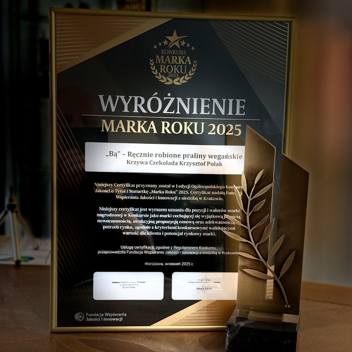 Z dumą informujemy, że nasze czekoladki zostały uhonorowane prestiżowym wyróżnieniem "Marka Roku 2025" za innowacyjność i doskonały smak. Doceniono nasze zaangażowanie w tworzenie produktów najwyższej jakości z naturalnych składników, bez sztucznych dodatków.